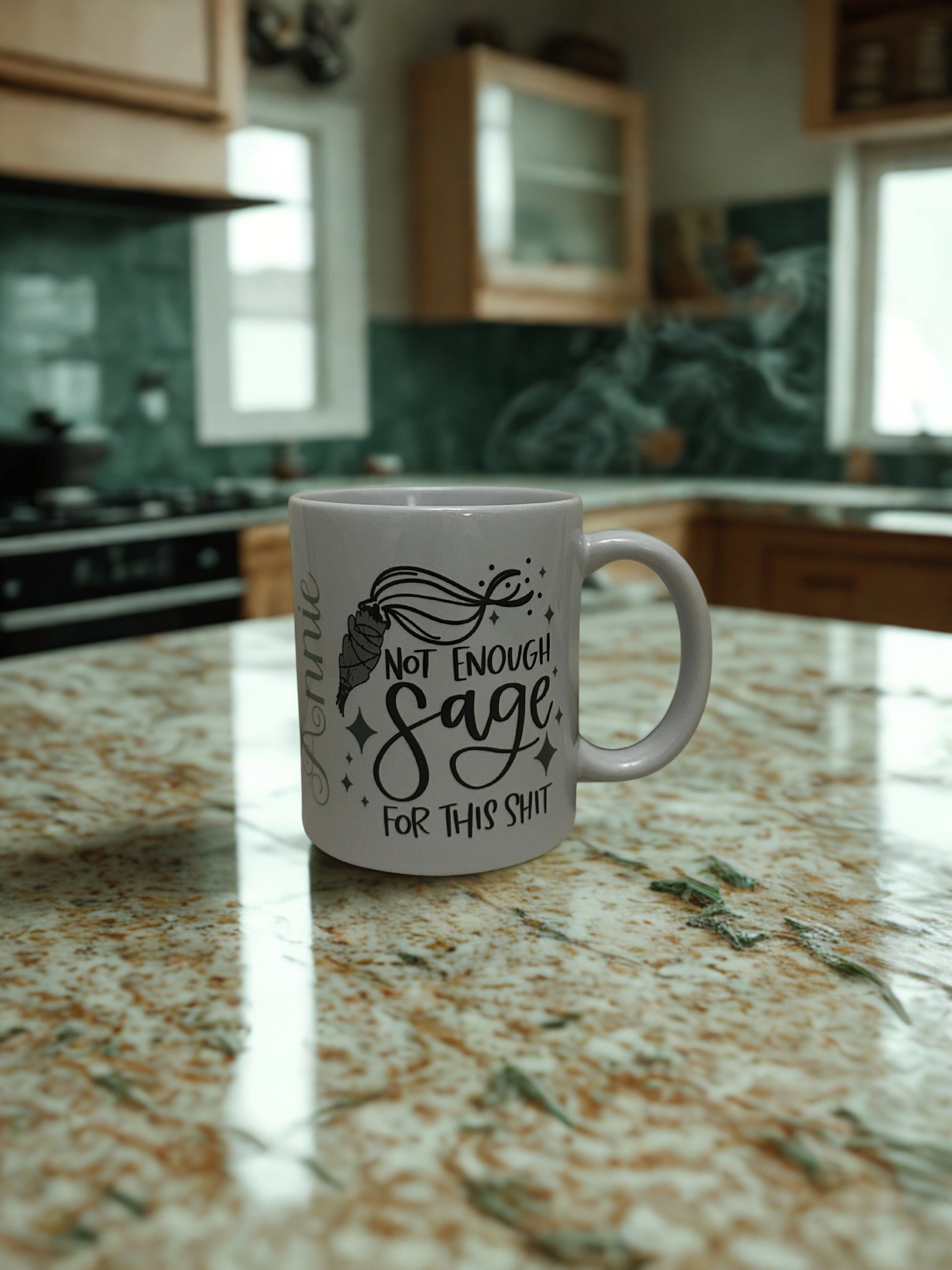 The "Not Enough Sage for This Shit" personalised mug is designed for those who appreciate a touch of humour with their daily beverage. Made from durable ceramic, it offers excellent heat retention, ensuring optimal enjoyment of hot drinks. making it a thoughtful gift option.
